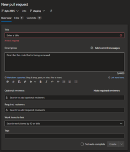 - The pull request will trigger any pull request pipelines, and the reviewers notified that a PR is ready for review. In the event there are any pipeline issues, they will need to be remediated and new changes pushed into the same branch. This will re-trigger the pipelines, and a new PR DOES NOT need to be created.